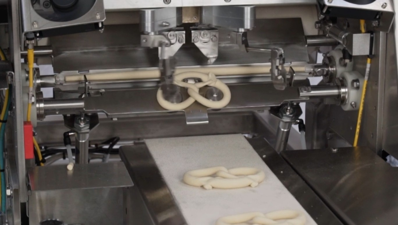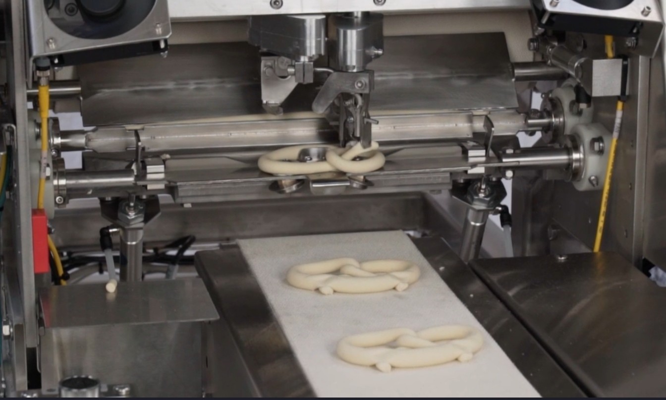 The system created dough noodles from an upstream extruder, using conveyors, and precisely feeds them into a sequence of forming stations. Advanced controls and timing ensure each dough strand is handled consistently, accurately positioning it for the twisting mechanism. The machine’s mechanically driven arms then twist the dough into the characteristic pretzel knot shape at high throughput rates. This automation reduces labor costs, improves product uniformity, increases output, and enhances food safety by minimizing operator’s direct contact with the dough.